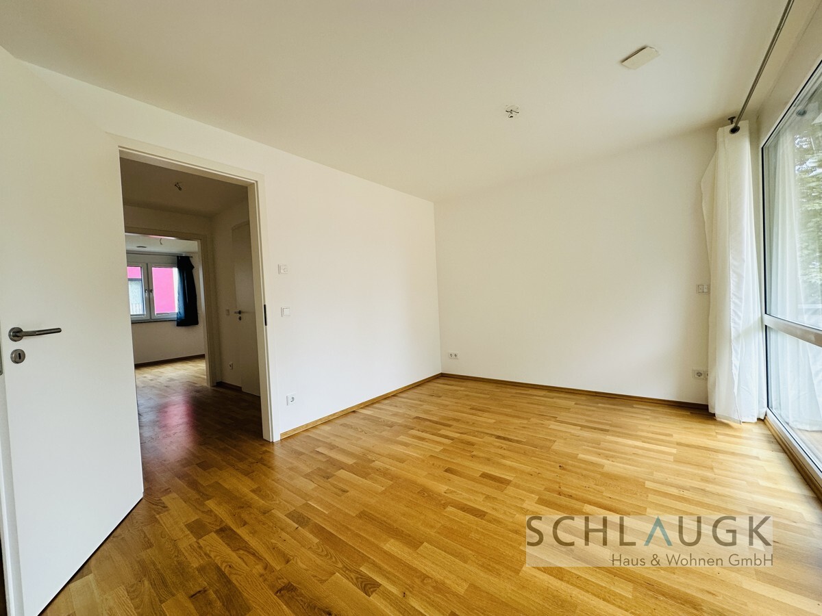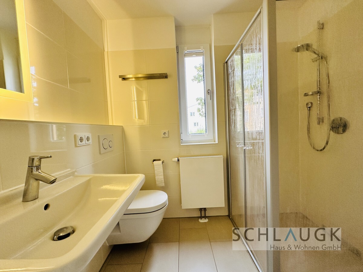 Das Schlafzimmer bietet ausreichend Platz für ein großes Bett und einen Kleiderschrank. Das Badezimmer ist modern ausgestattet und verfügt über eine Dusche, ein Waschbecken und eine Toilette. Hier befindet sich auch der Waschmaschinenanschluss.