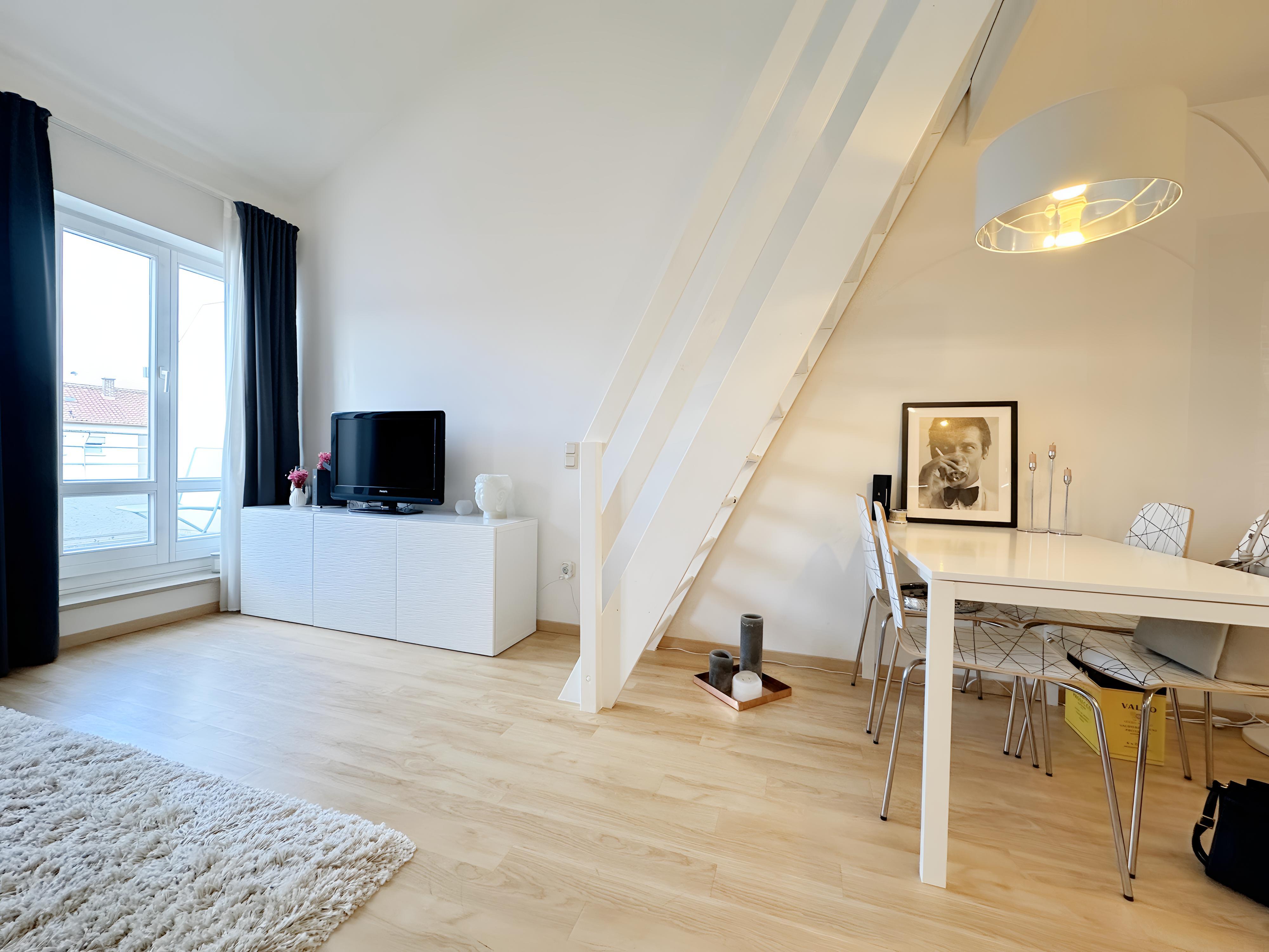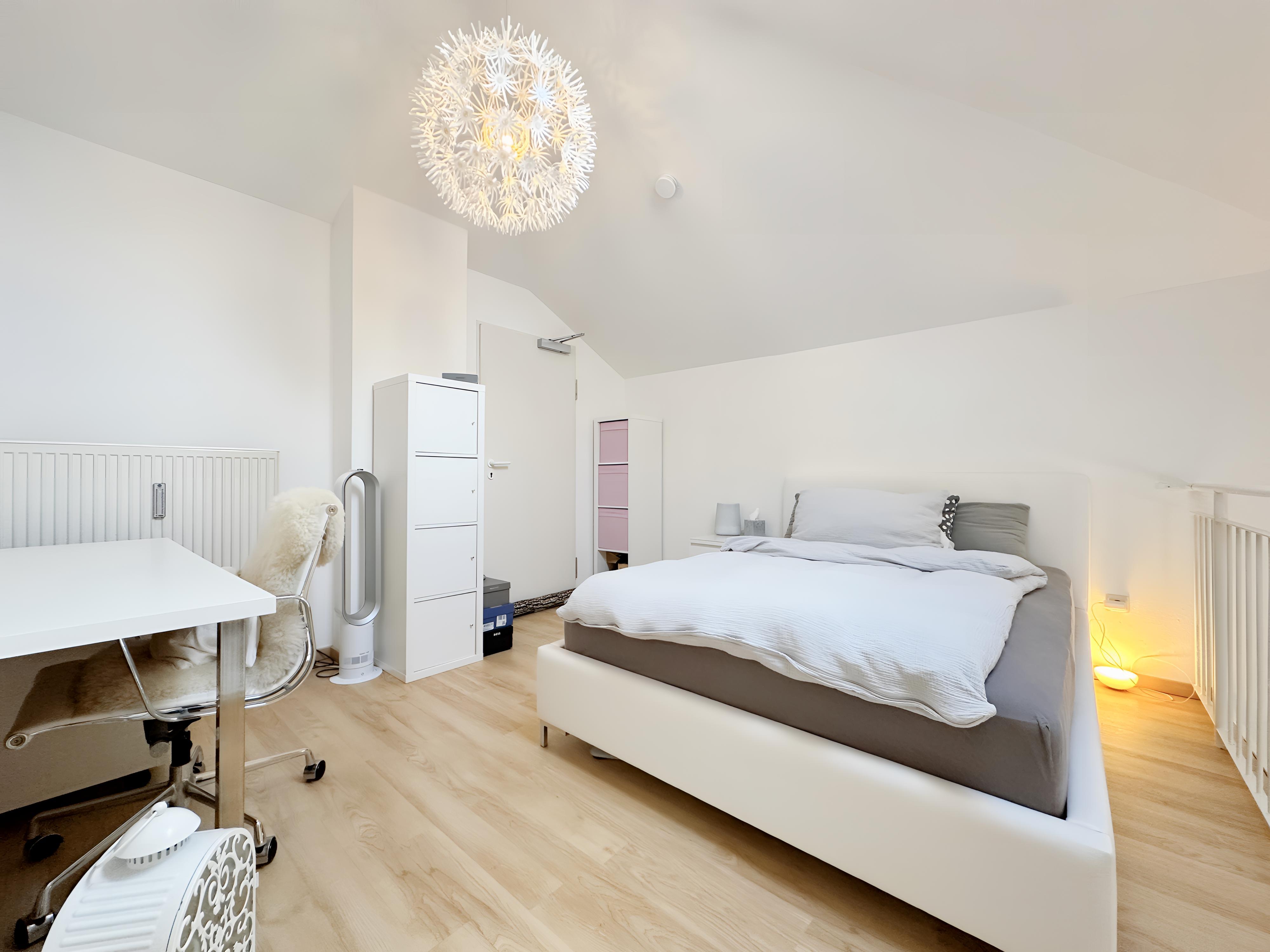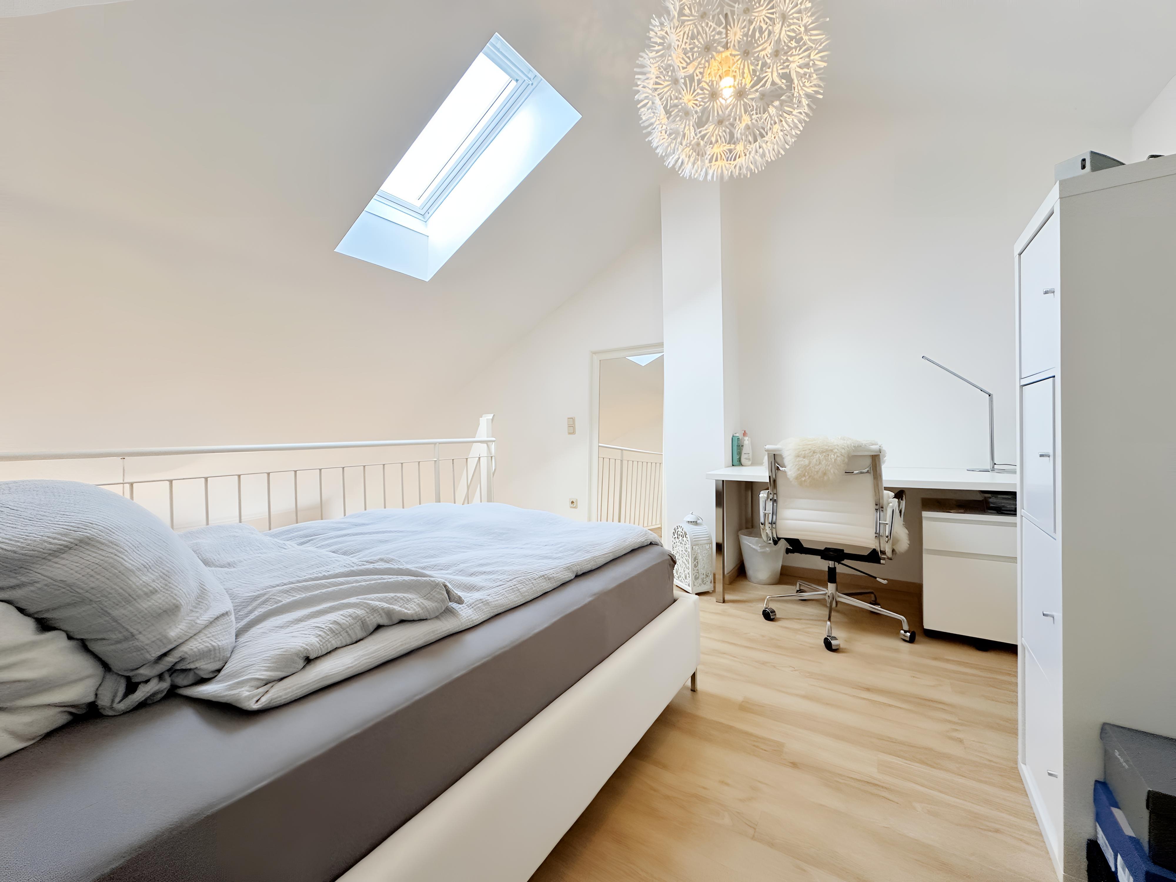 Eine besondere Attraktion dieser Wohnung ist die Treppe im Wohnzimmer, die zum oberen Schlafbereich führt. Hier oben erwartet Sie nicht nur ein gemütliches Schlafzimmer, sondern auch ein praktischer Speicherraum, der zusätzlichen Stauraum bietet. Das Schlafzimmer ist eine wahre Ruheoase, die zum Entspannen einlädt.