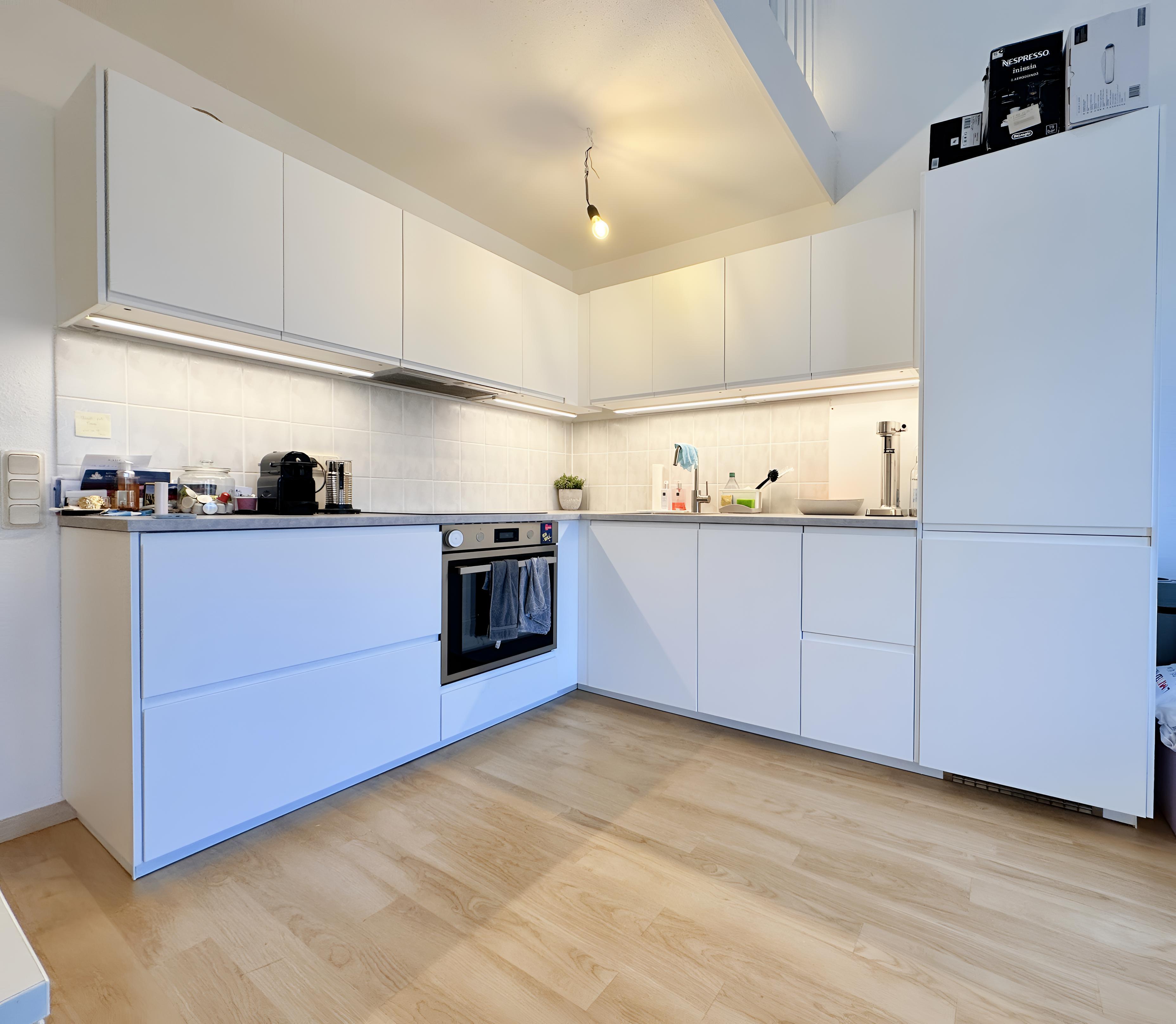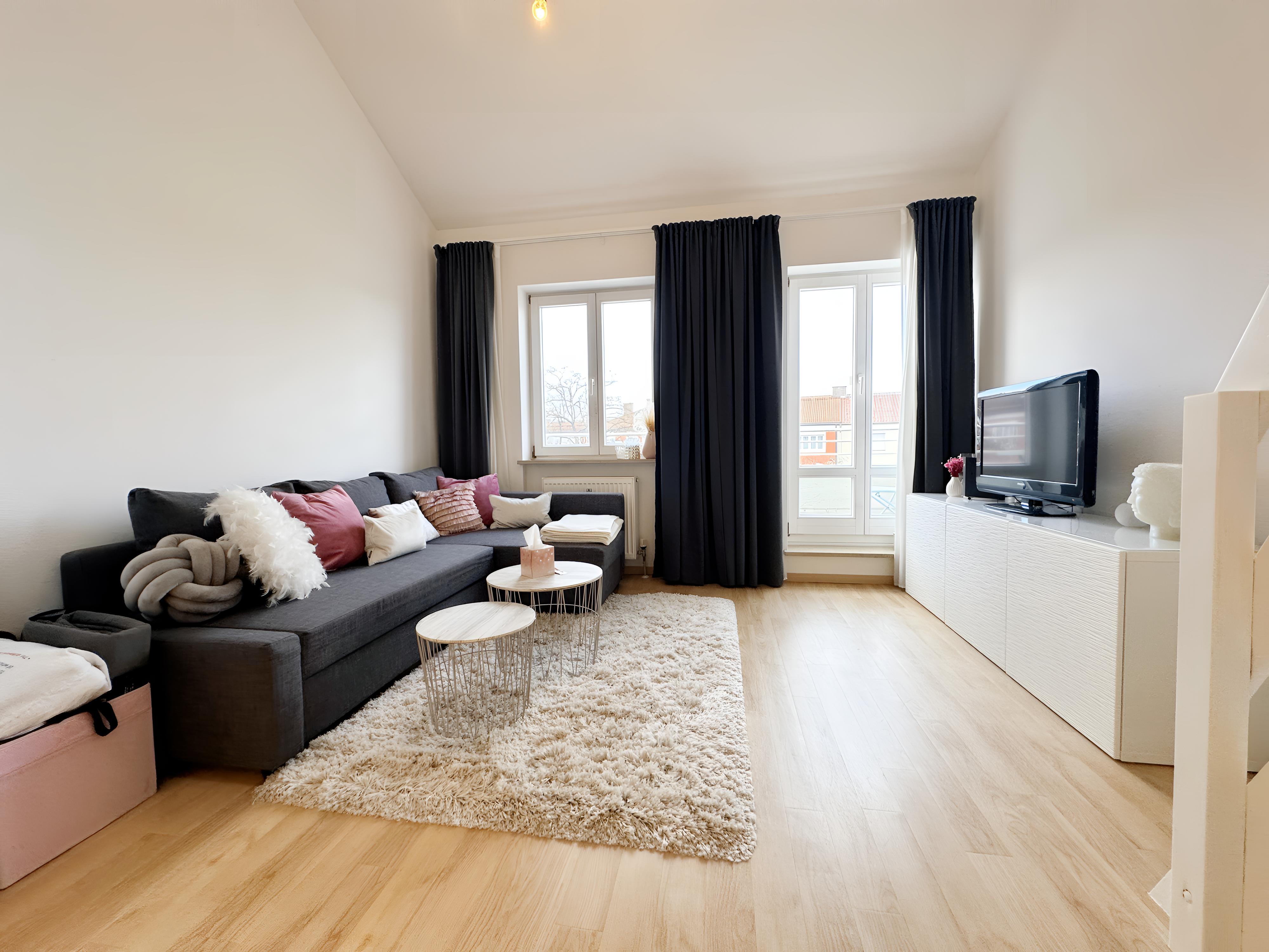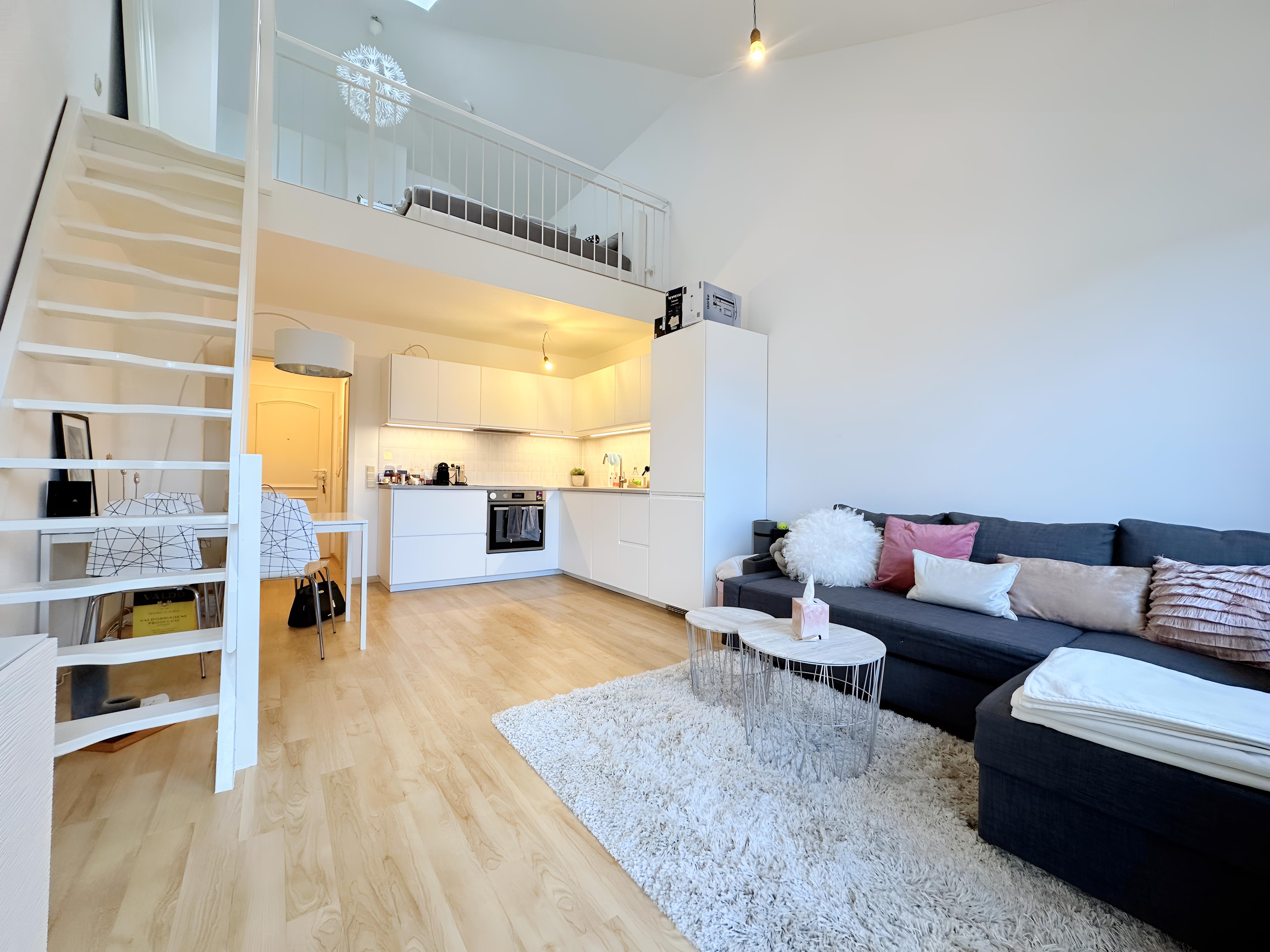 Eine besondere Attraktion dieser Wohnung ist die Treppe im Wohnzimmer, die zum oberen Schlafbereich führt. Hier oben erwartet Sie nicht nur ein gemütliches Schlafzimmer, sondern auch ein praktischer Speicherraum, der zusätzlichen Stauraum bietet. Das Schlafzimmer ist eine wahre Ruheoase, die zum Entspannen einlädt.
