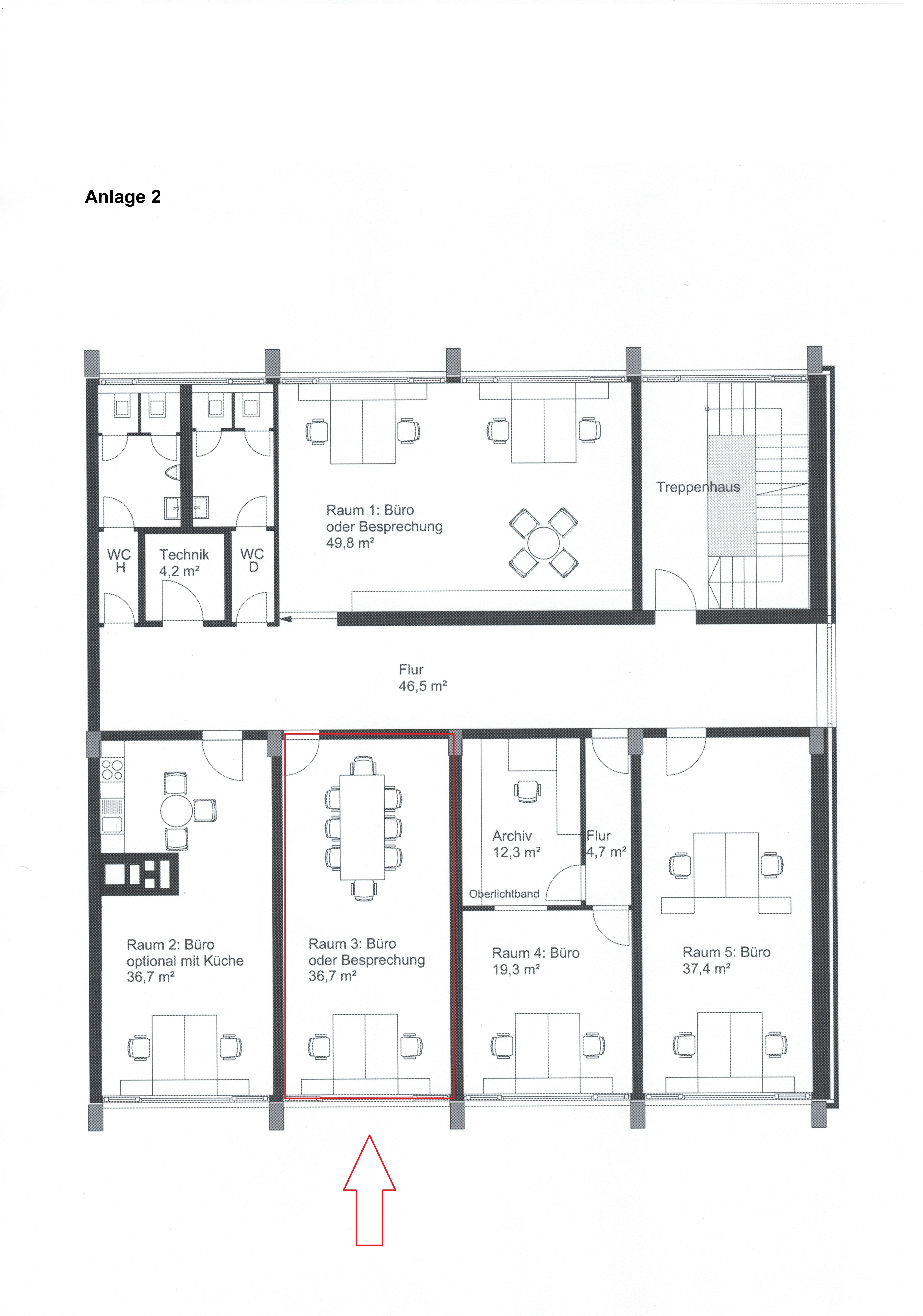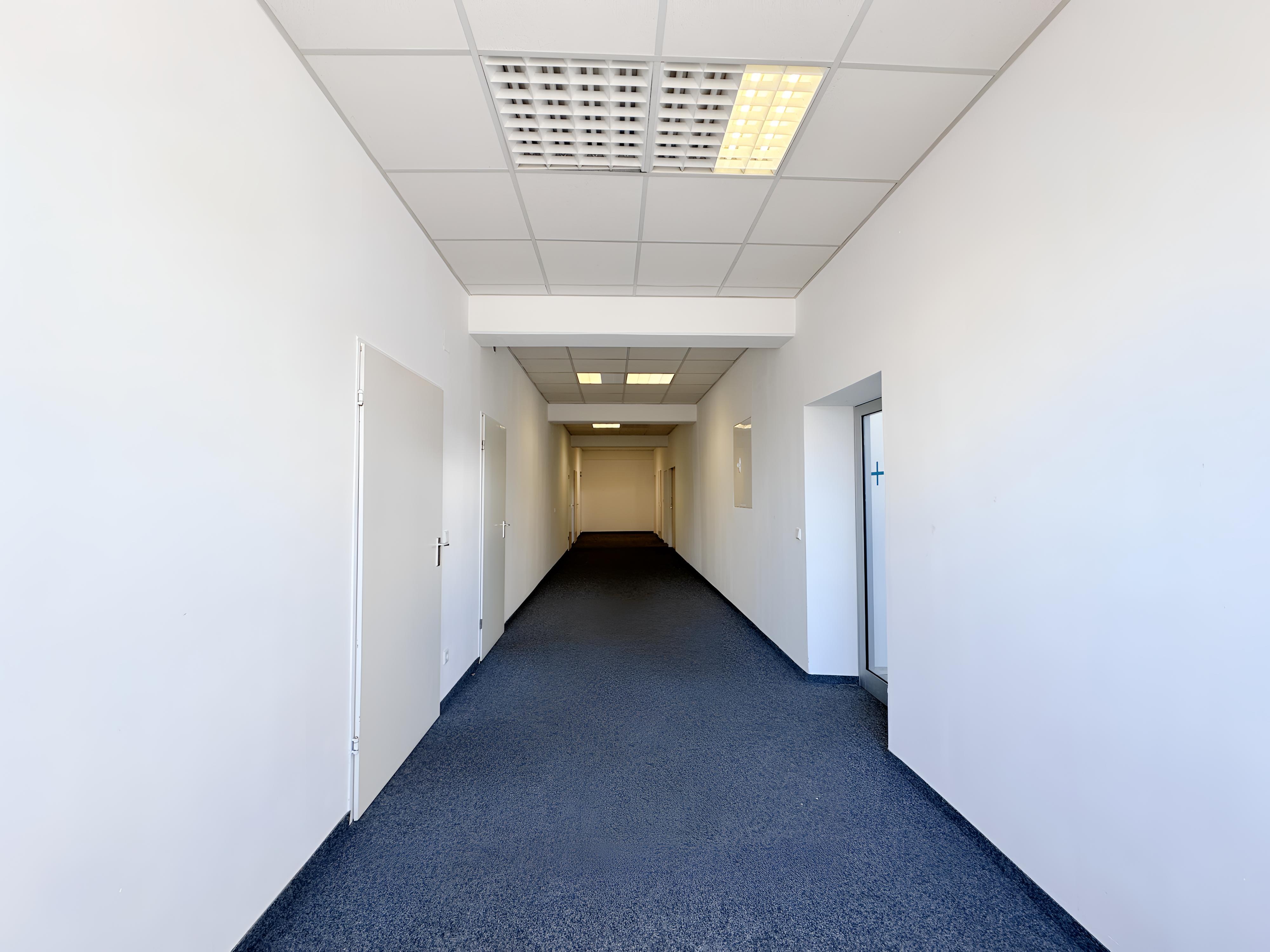 Die Ausstattung der Räumlichkeiten ist als normal zu bezeichnen und umfasst unter anderem einen Teppichboden als Bodenbelag. Außerdem gehört ein Außenstellplatz zur Büroetage, der zu einem Preis von 90 € angemietet werden kann. Zur weiteren Ausstattung gehören separate WC-Anlagen für Damen und Herren, die den Komfort im Büroalltag erhöhen.