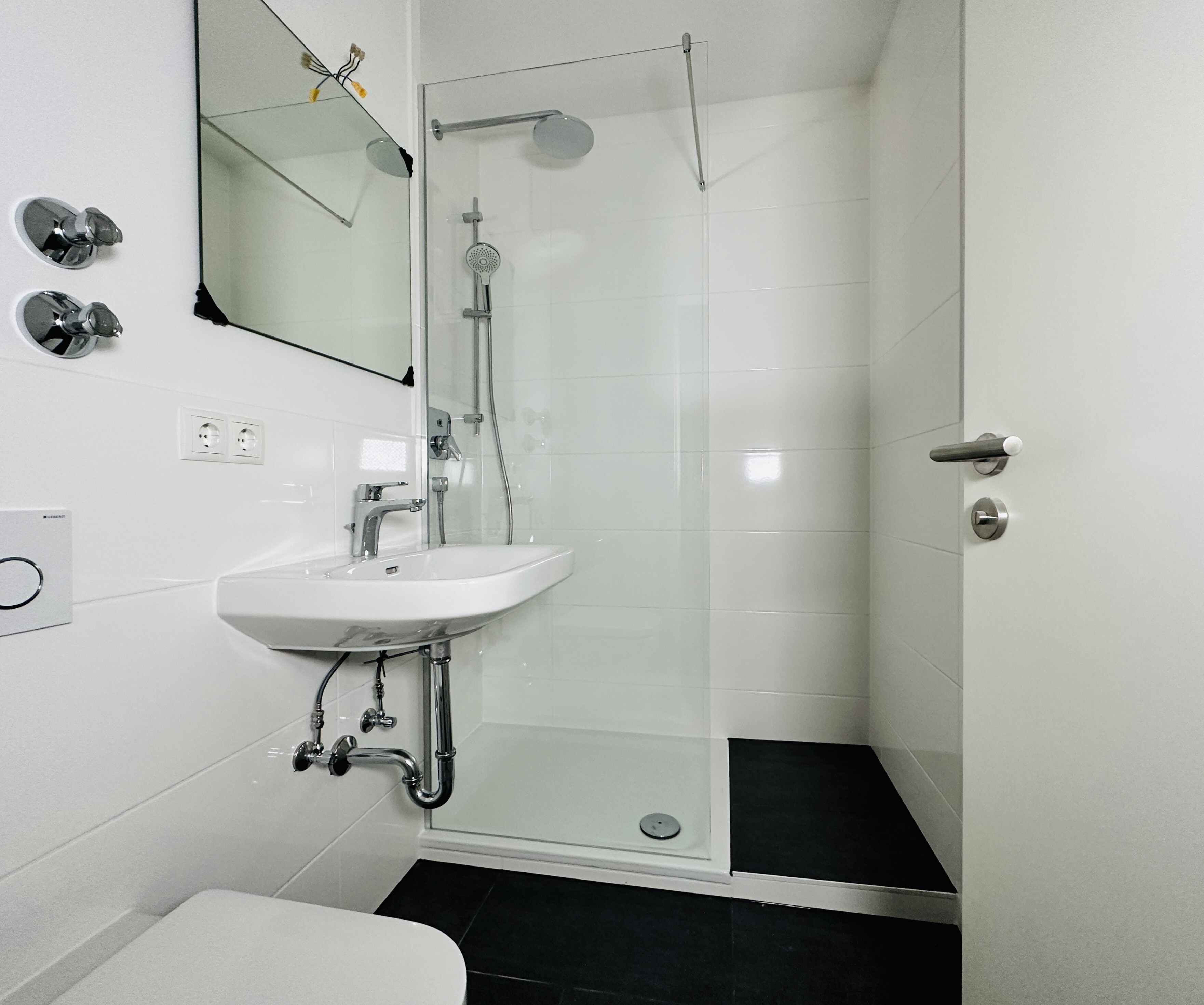 Die Wohnung verfügt über ein gemütliches Schlafzimmer sowie einen hellen Wohnbereich, der vielfältige Gestaltungsmöglichkeiten bietet. Das moderne Badezimmer ist mit einer praktischen Dusche ausgestattet.