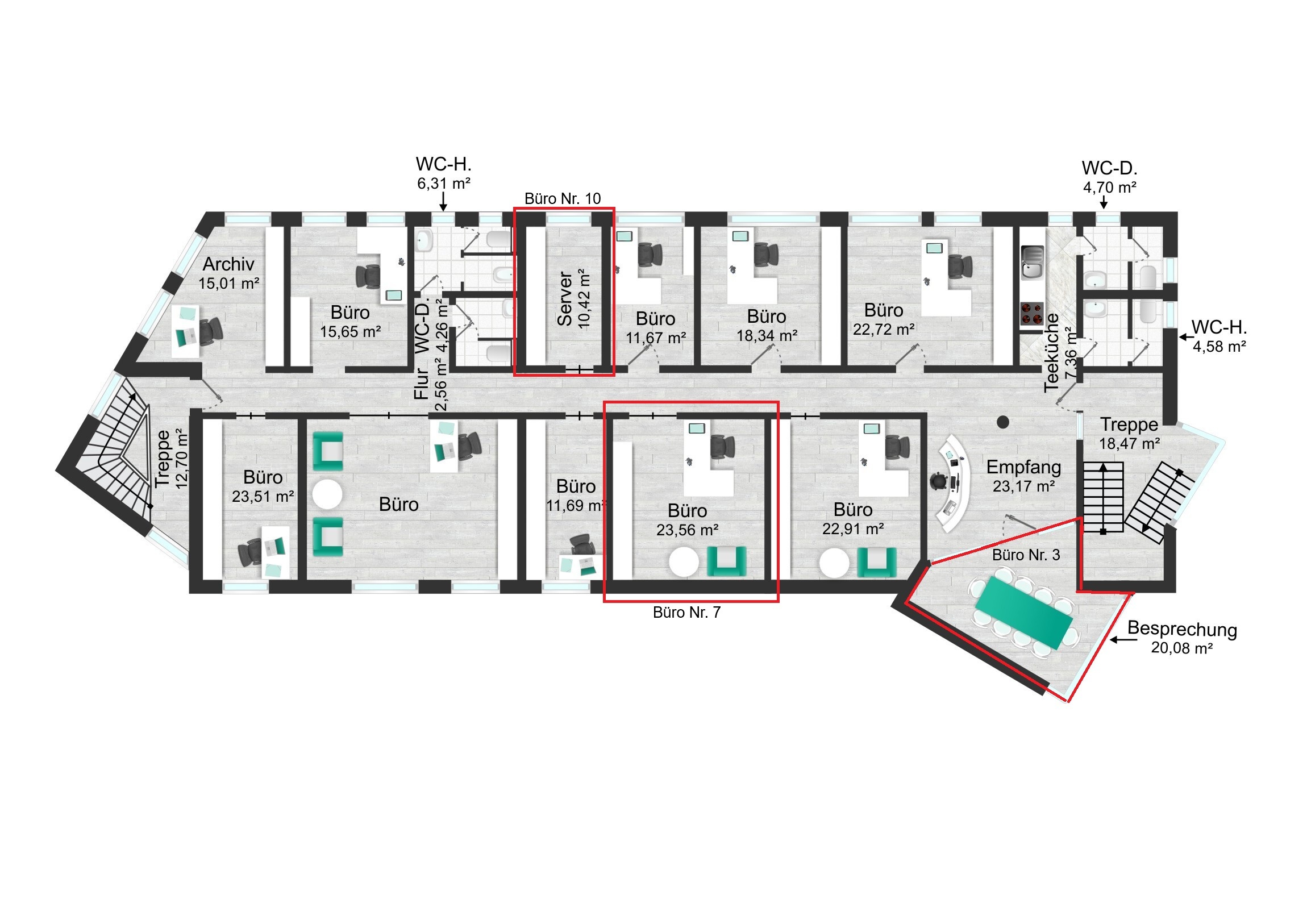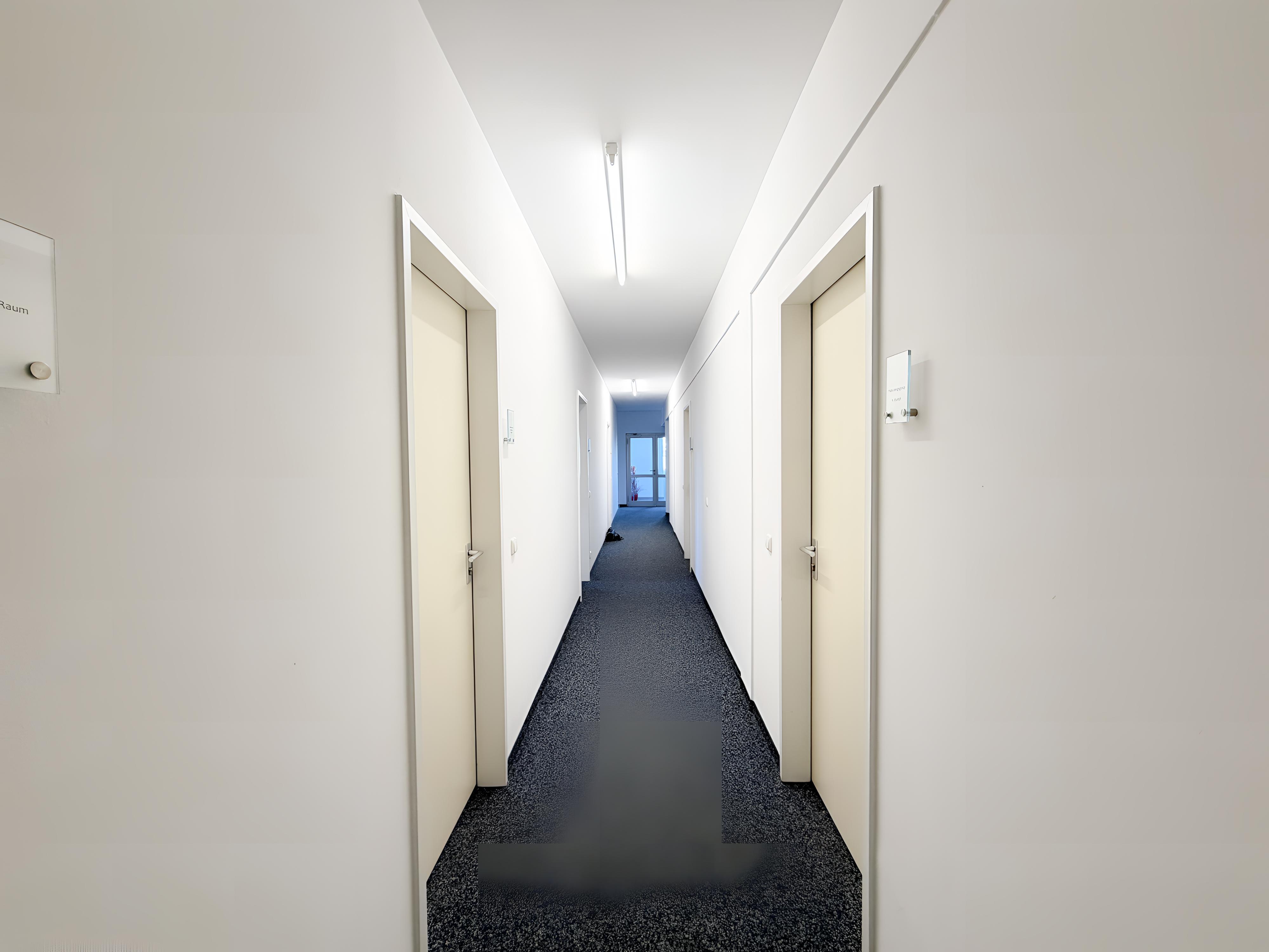 Auf derselben Etage befinden sich zwei weitere Büroräume, sodass bei Bedarf auch mehrere Räume gemeinsam angemietet werden können – ideal für wachsende Teams oder Unternehmen.